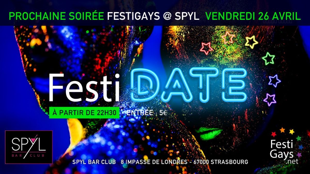 FestiDate est votre nouveau rendez-vous LGBTI+, organisé une fois par mois au SPYL par le Collectif FestiGays ! Ces rendez-vous seront placés sous le signe des RENCONTRES, dans la vraie vie !!! Alors laissez votre timidité au placard, échappez-vous du train-train et venez papoter et danser sur la musique de DJ CHILK.